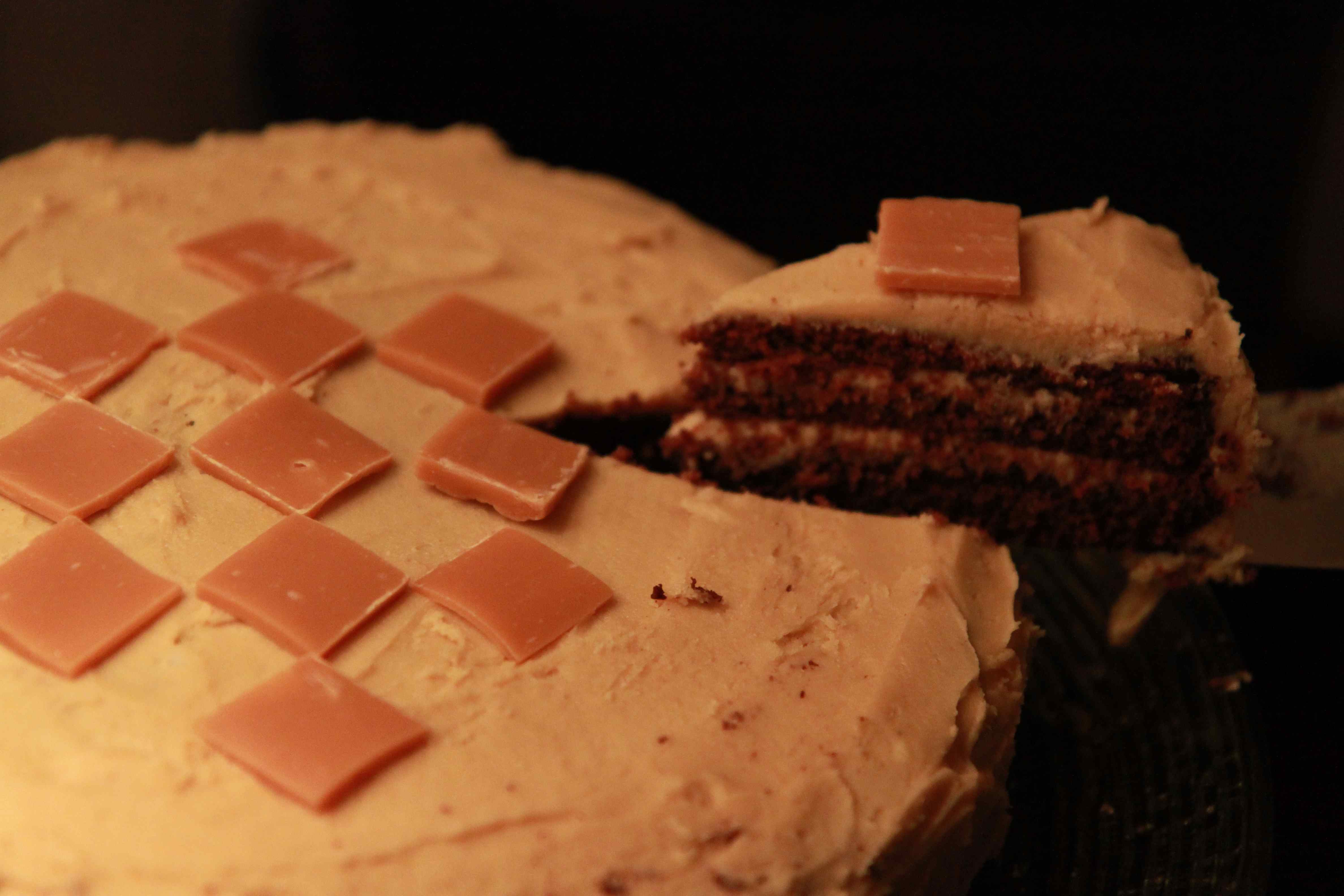 Favorittgodteriet hennar er fudge, dei firkanta karamellterningane som du får kjøpt i godtedisken. Difor planla eg å lage ei kake der eg brukte fudge i kaka. Eg endte opp med denne sjokoladekaka, som vart fylt og dekt med ein krem der fudge spelte ei hovudrolle.